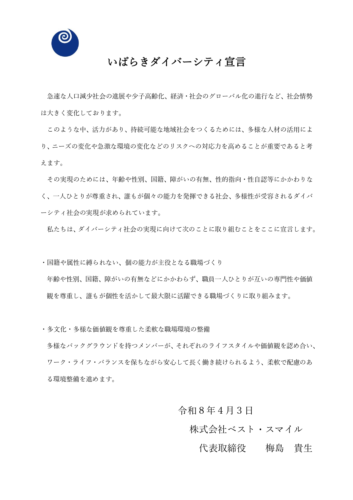 当社はこの度、茨城県が推進する「いばらきダイバーシティ宣言」の趣旨に賛同し、登録いたしました。